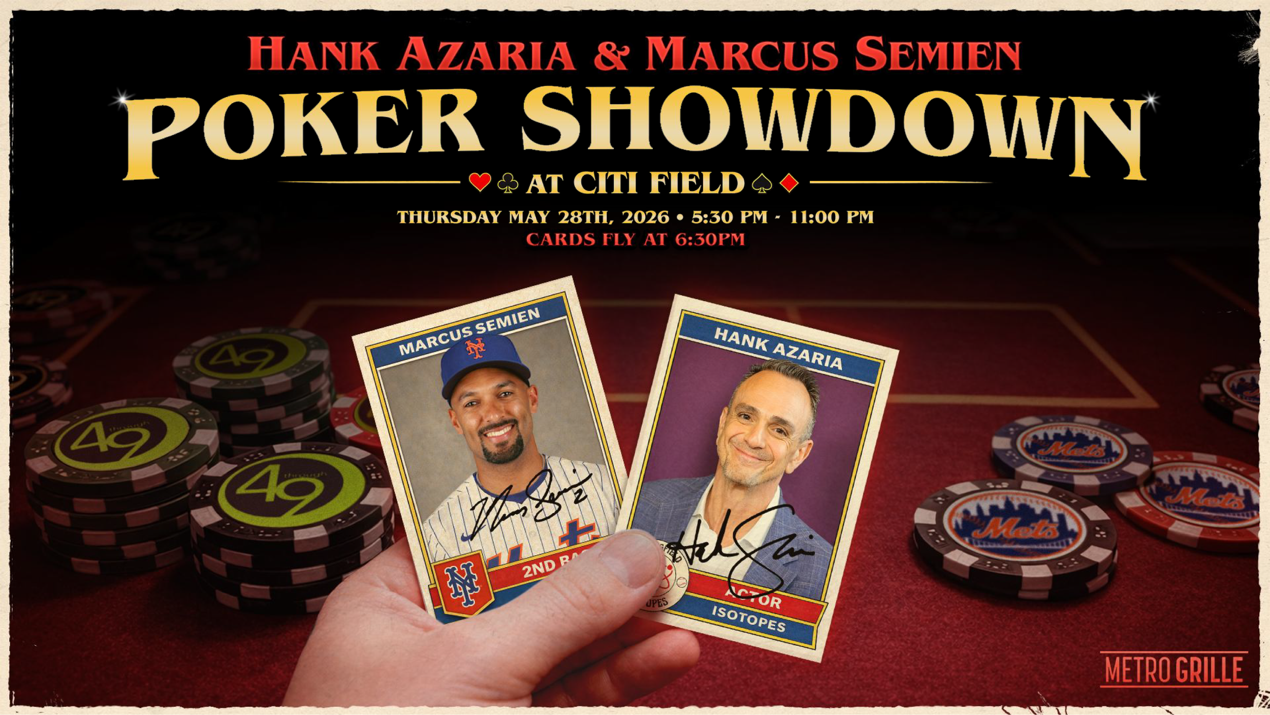 On Thursday, May 28th, Emmy Award winner Hank Azaria and the Mets’ newest infielder, All-Star and World Series Champion Marcus Semien, will come together for the annual Poker Showdown at Citi Field.